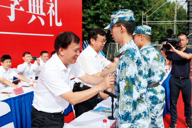 校党委书记葛世伦、校长周南平给2020级本科生代表、管理科学与工程类新生沙晏民,海洋工程类新生徐开开颁授江苏科技大学校徽,“一入科大门,一生科大人”,此刻起,2020级新生就是江科大的主人。