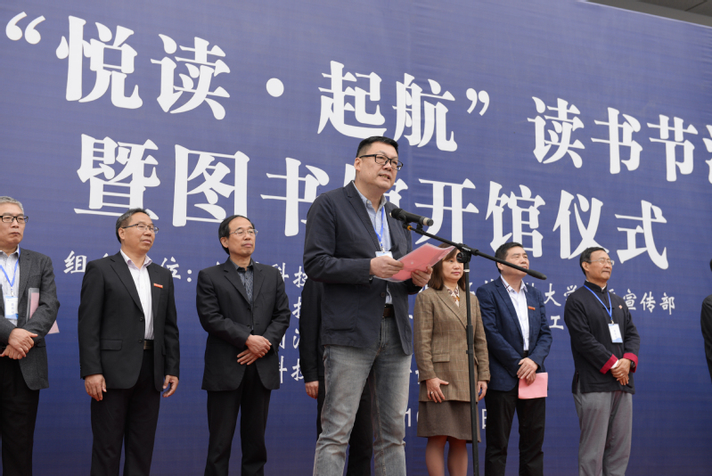 副校长谈镇宣布读书节开幕、图书馆开馆,并在参会嘉宾及参与师生的见证下和与会专家、领导共同为新馆剪彩。