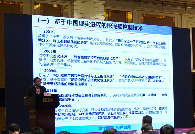 俞孟蕻教授作题为“挖泥船控制技术与精确疏浚”的报告,结合中国疏浚技术二十余年的发展进程,阐述了挖泥船控制技术与精确疏浚技术的任务目标,分析了挖泥船集成控制系统与精确疏浚的技术体系,重点介绍了挖泥船计算机辅助决策系统、挖泥船功率管理系统、挖泥船DTPM系统、挖泥船远程监控与调度系统、挖泥船动力定位与动态跟踪系统的构成及其持续进阶的关键技术,简述了智能疏浚技术特征、智能挖泥船关键技术及其实现途径,被与会专家学者一致公认为“控制理论工程化应用”的典型案例,引起强烈反响。