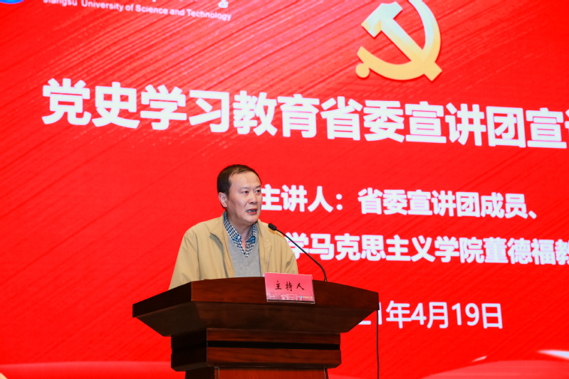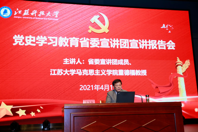 4月19日下午,党史学习教育省委宣讲团在江苏科技大学进行宣讲,省委宣讲团成员、江苏大学马克思主义学院教授董德福作宣讲报告。本次宣讲报告主会场设在长山校区船苑剧场,分会场设梦溪校区演讲厅和张家港校区、苏州理工学院文心会堂。校领导周南平、景旭文、许俊华、俞孟蕻、郑培钢、嵇春艳出席报告会。全校科级以上干部、马克思主义学院全体教师、全体辅导员、学生党员、入党积极分子等聆听宣讲报告。党委常委、副校长汤建主持宣讲报告。