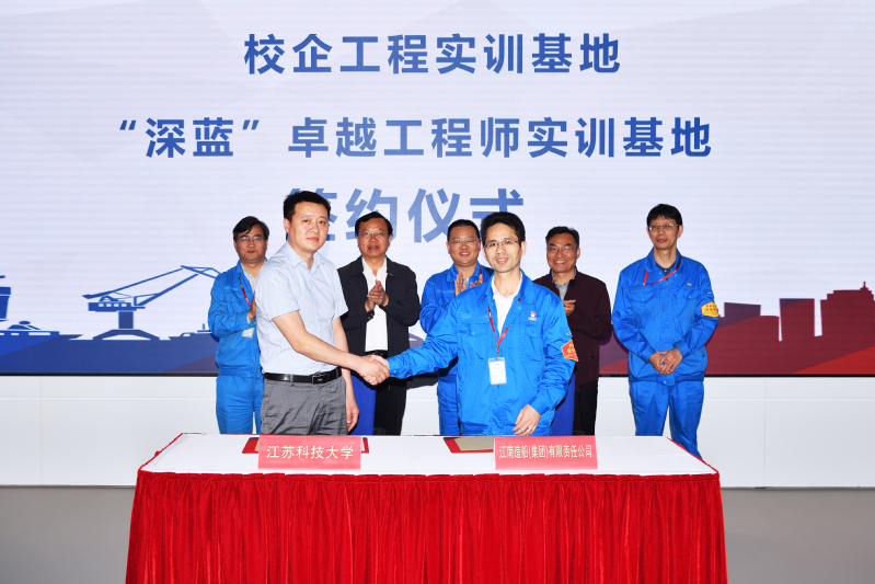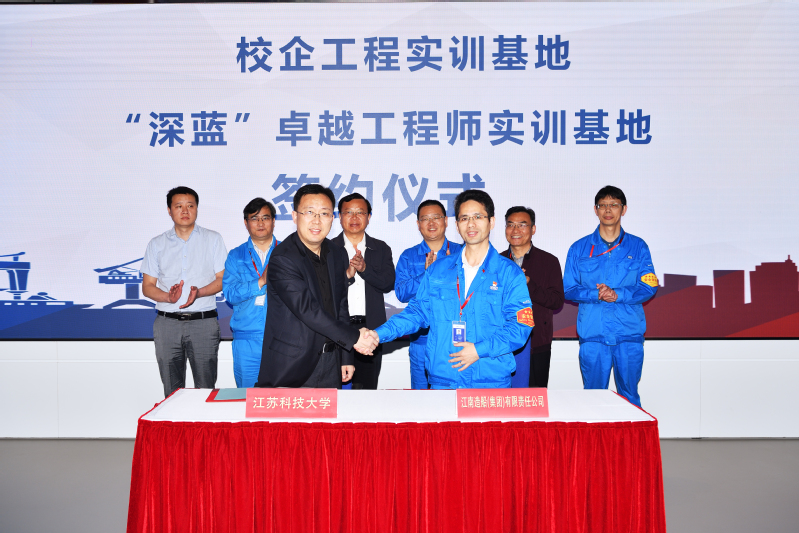 仪式上,江南造船公司人力资源部部长罗厚毅与江苏科技大学人事处副处长钱安其签署校企工程实训基地共建协议,与教务处处长田剑签署“深蓝”卓越工程师实训基地共建协议。