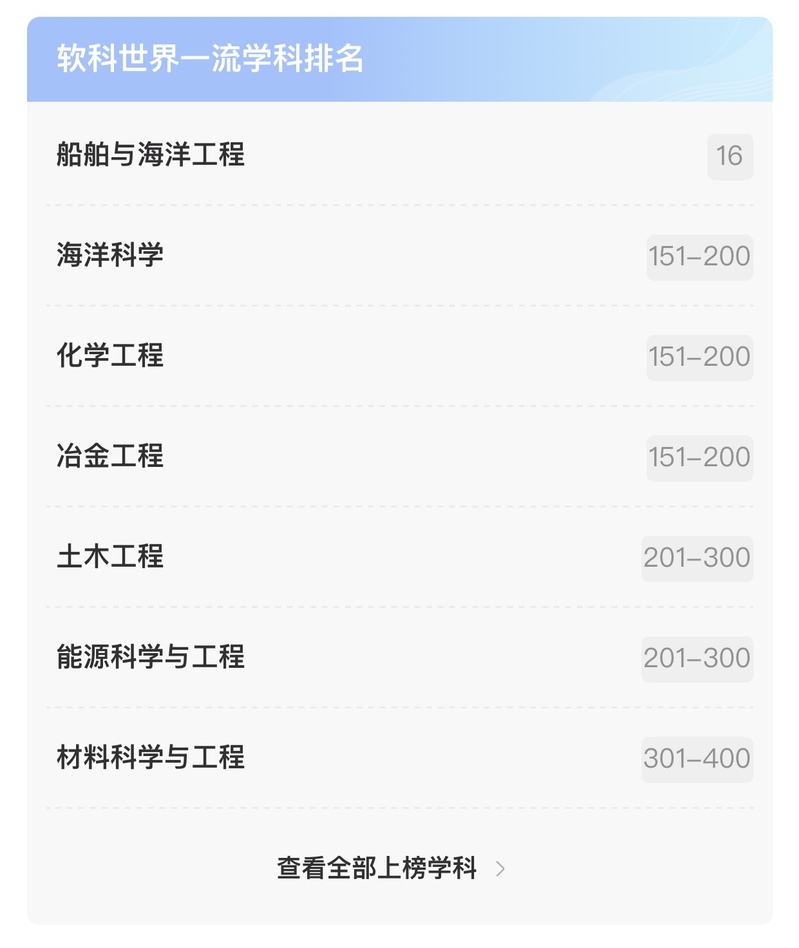 5月26日,上海软科(ShanghaiRanking's Global Ranking of Academic Subjects)发布“2021软科世界一流学科排名”,江苏科技大学7个学科进入排行榜,较2020年增加1个学科,入选学科为船舶与海洋工程、海洋科学、化学工程、冶金工程、土木工程、能源科学与工程、材料科学与工程。其中,船舶与海洋工程学科排名位列全国第9位,世界第16位;海洋科学学科、化学工程学科、冶金工程学科分别位列世界151-200位;土木工程、能源科学与工程学科进入世界201-300位;材料科学与工程学科位列世界301-400位。海洋科学学科首次入选软科世界一流学科排行榜,进一步彰显了我校的办学特色。