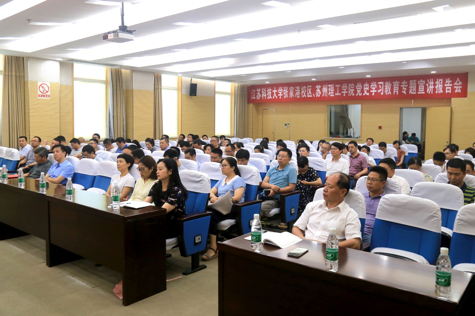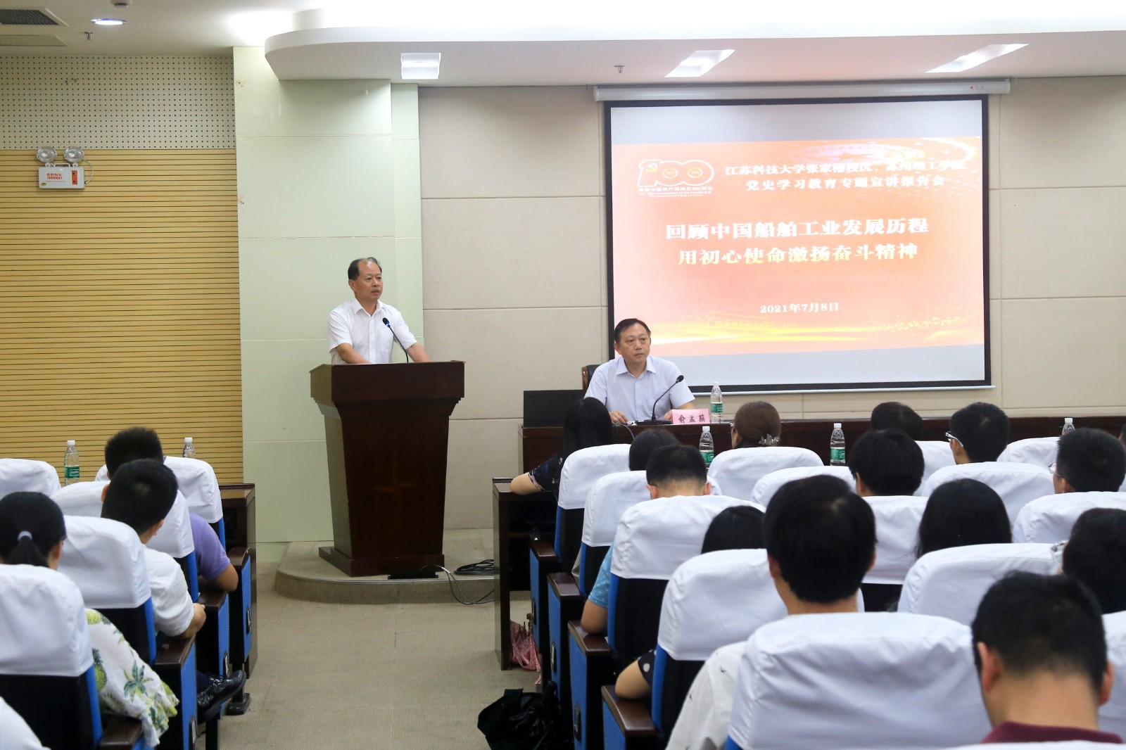 7月8日,江苏科技大学张家港校区、苏州理工学院举行党史学习教育专题报告会。江苏科技大学党委常委、副校长、张家港校区党委书记、管委会主任、苏理工党委书记、院长俞孟蕻作《回顾中国船舶工业发展历程 用初心使命激扬起奋斗精神》主题报告。校区、苏理工领导班子、科级以上干部、党支部书记及部分教职工100余人聆听了报告。报告由校区党委常务副书记、管委会副主任、苏理工党委常务副书记、副院长杨福章主持。