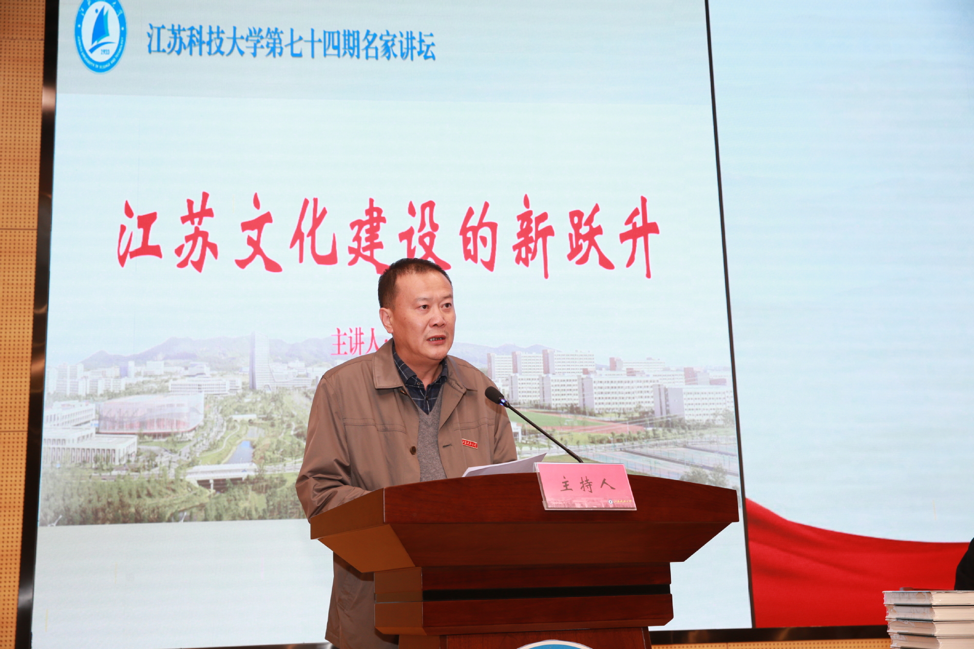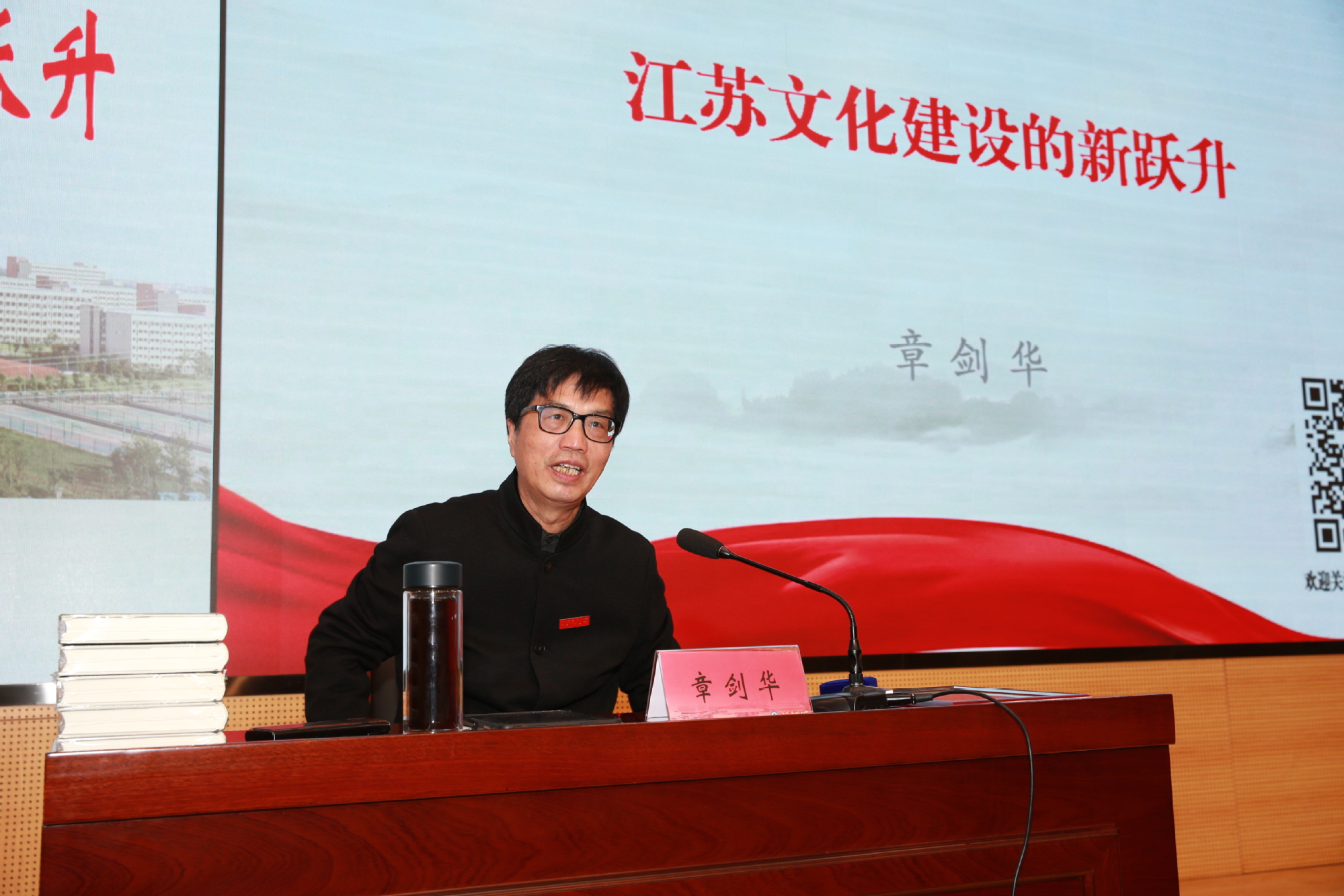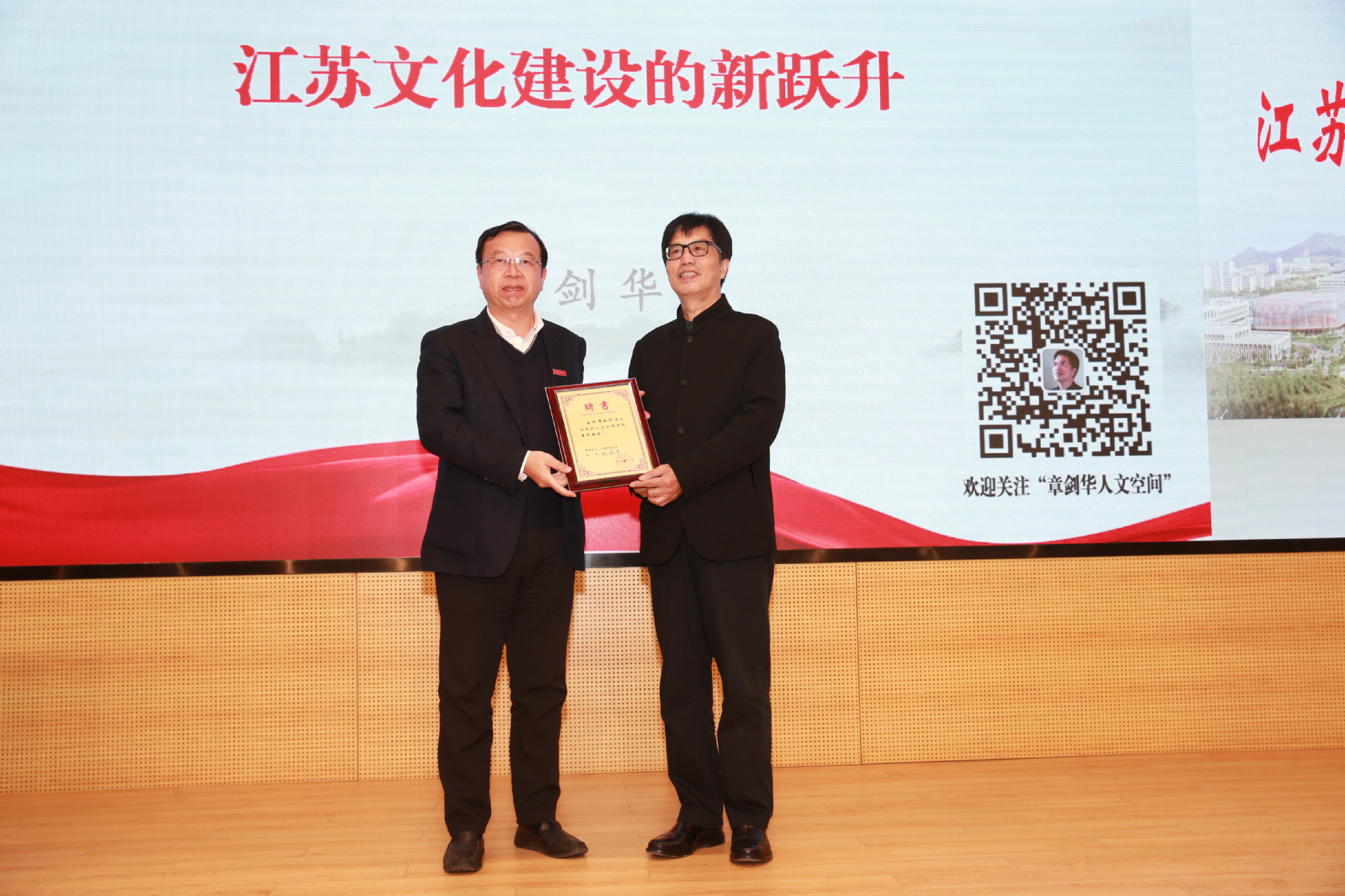 11月17日下午,江苏科技大学第七十四期“名家讲坛”在长山校区图书馆105报告厅举行。江苏省文学艺术界联合会主席章剑华教授应邀做《江苏文化建设的新跃升》主题报告。党委副书记、校长周南平出席报告会,现场为章剑华颁发兼职教授聘书,并且赠送校徽。