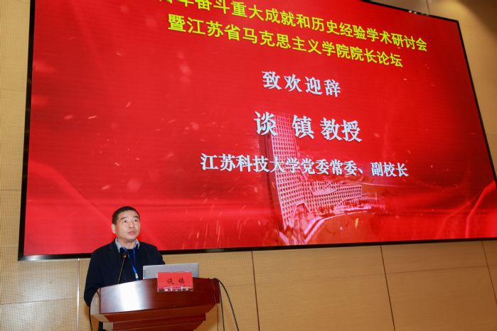 江苏科技大学党委常委、副校长谈镇教授致欢迎辞,他向参会嘉宾详细介绍了江苏科技大学的办学历史、办学特色、服务国家重大战略情况,重点介绍了我校围绕“把马克思主义氛围搞的浓浓的、让马克思主义旗帜高高飘扬”的目标,切实加强马克思主义学院建设的举措。强调了十九届六中全会召开的重大意义以及本次论坛召开对我校建好马克思主义理论学科的重要意义。