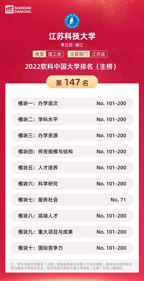 4月19日,高等教育专业评价机构软科今日正式发布“2022软科中国大学排名”。江苏科技大学位列中国高校第147位,在江苏高校中排名第18位。