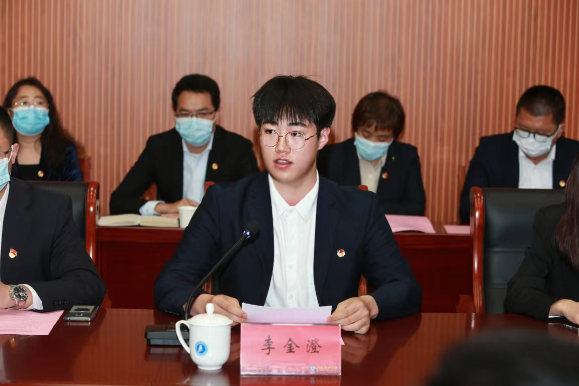 “立志在科研中锤打,在学习中进步,在实践中成长,在服务和奉献中绽放,争做理想远大、信念坚定的模范,争做刻苦学习、锐意创新的模范,争做敢于斗争、善于斗争的模范,争做艰苦奋斗、无私奉献的模范,争做崇德向善、严守纪律的模范,坚定不移听党话、跟党走,把青春融入学业、事业全过程,努力为我校建设国内一流造船大学而奋斗,努力为实现中华民族伟大复兴中国梦而奋斗!”全国优秀共青团员、船舶与海洋工程学院2018级本科生李金澄,中国大学生自强之星、材料科学与工程学院2018级本科生王程程结合自身学习工作经历分别汇报了学习体会。