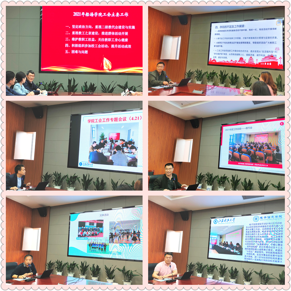 5月12日下午,江苏科技大学2021年度二级工会工作汇报总结交流活动在长山校区行政楼200号会议室举行。校党委副书记、副校长、工会主席景旭文出席,各二级工会主席、校工会工作人员等30余人参加,活动由校工会常务副主席郭永强主持。