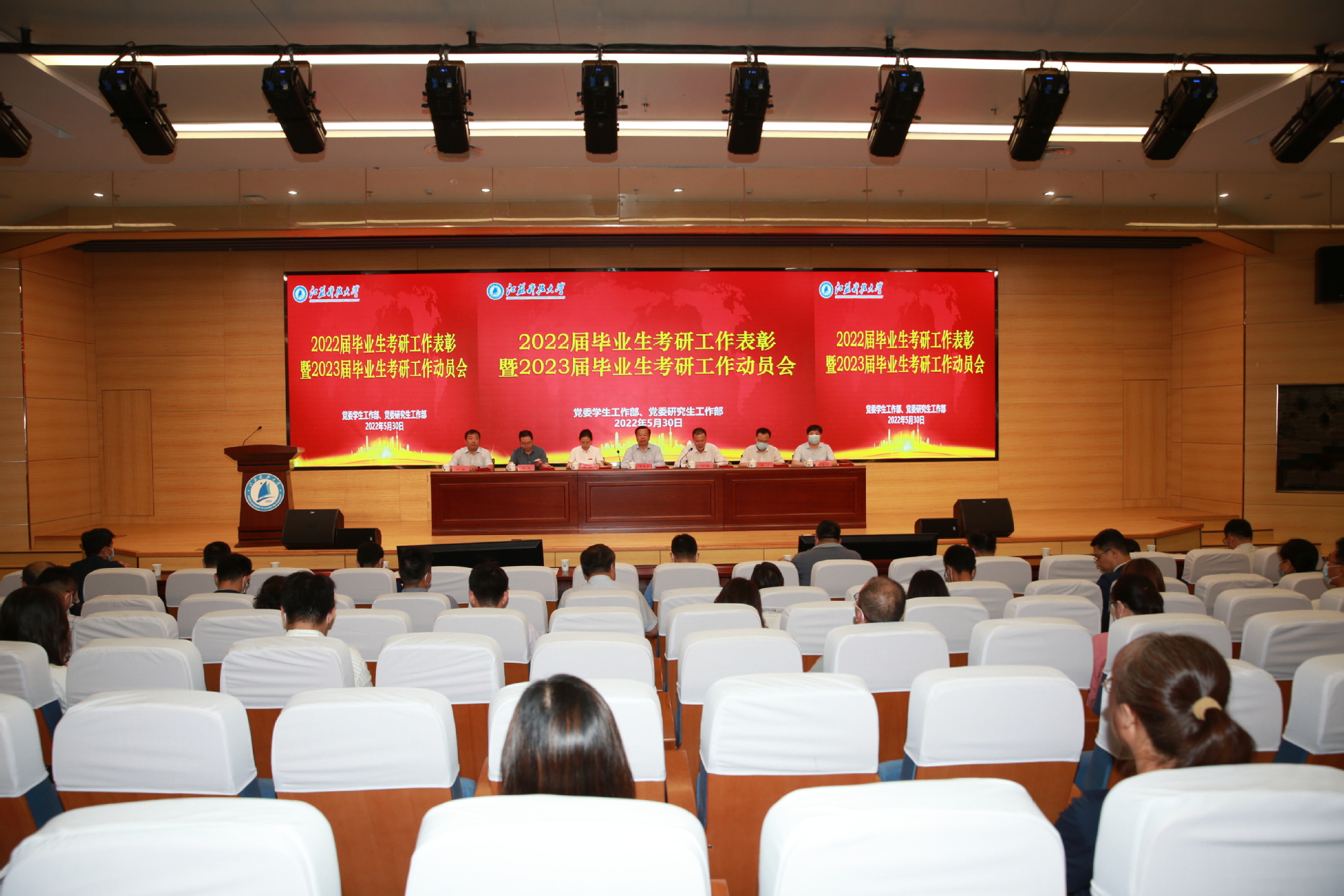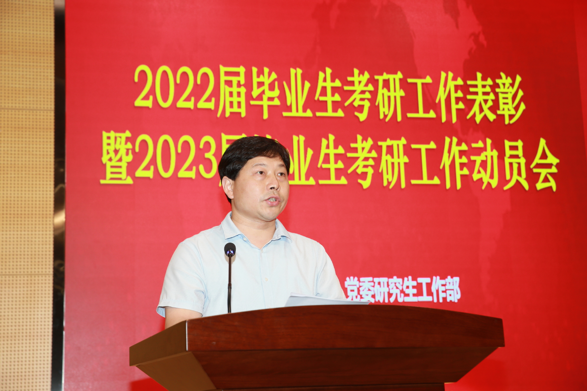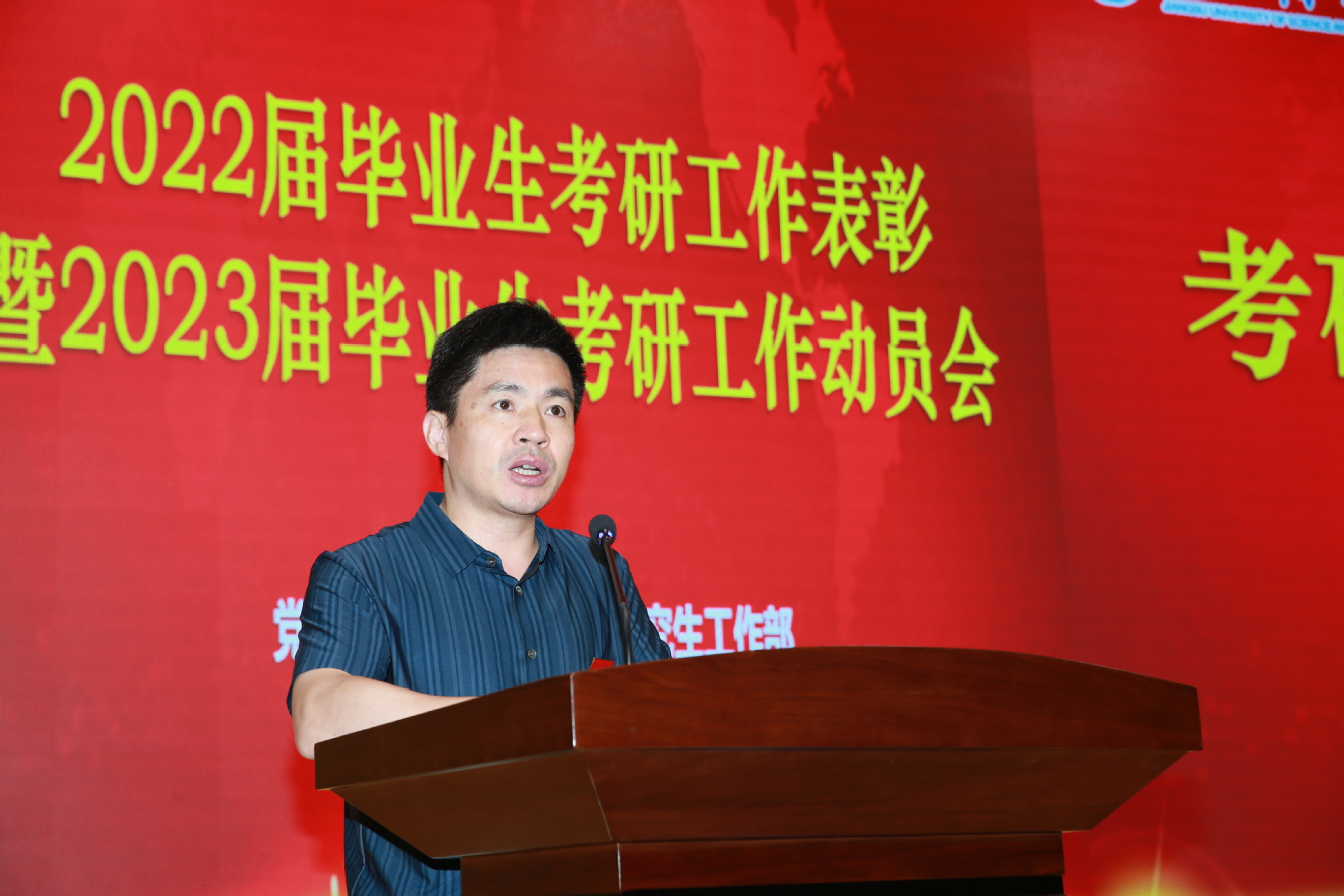 会上,学生处处长胡爱祥总结了2022届毕业生考研整体情况,部署了2023届毕业生考研指导工作。报告指出,我校2022届毕业生考研指导工作取得喜人成绩,考研报考率、初试达线率、最终录取率均稳步提升。截至5月30日,考研录取人数为1179人,录取率为28.78%,其中境外高校留学人数62人、“双一流”高校录取人数611人;深蓝学院深蓝班、粮食学院、材料学院等8个学院考研录取率超过29%;能动学院、船海学院、电信学院等10个学院的考研录取率较2021届有所增加,其中能动学院增幅最大,录取率比2021届增长14.44个百分点;10个班级的考研录取率超过50%,其中材料学院金属材料(腐蚀与防护方向)录取率达到65%;20个宿舍实现全员录取。报告指出,分析工作,总结经验,我校当前的考研指导工作仍存在三个方面的不足,具体体现在:人才培养与考研指导融合度需要进一步加强,考研指导实效性有待提升;学生学业基础与目标定位匹配度需要进一步提高,院校选择精准性有待提高;学校高质量发展对出国留学带动不够,学生培养国际化有待进一步加强。在对未来的工作规划中,报告提出,未来将强化培养学生的科研创新能力,不断提升学生考研竞争力;不断增强工作方法创新性,提升指导工作针对性;加大考研服务支持度,提升指导工作满意度。