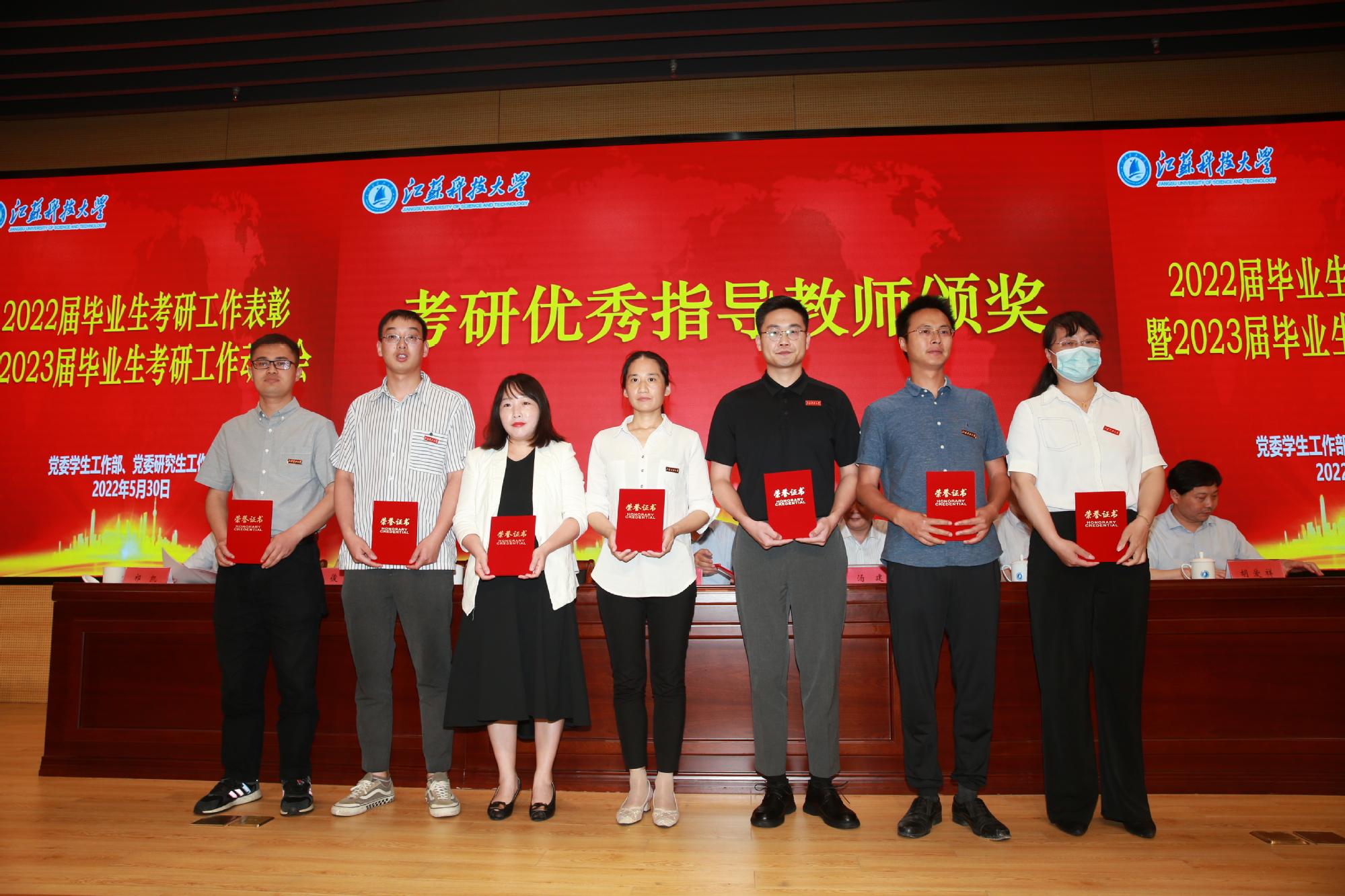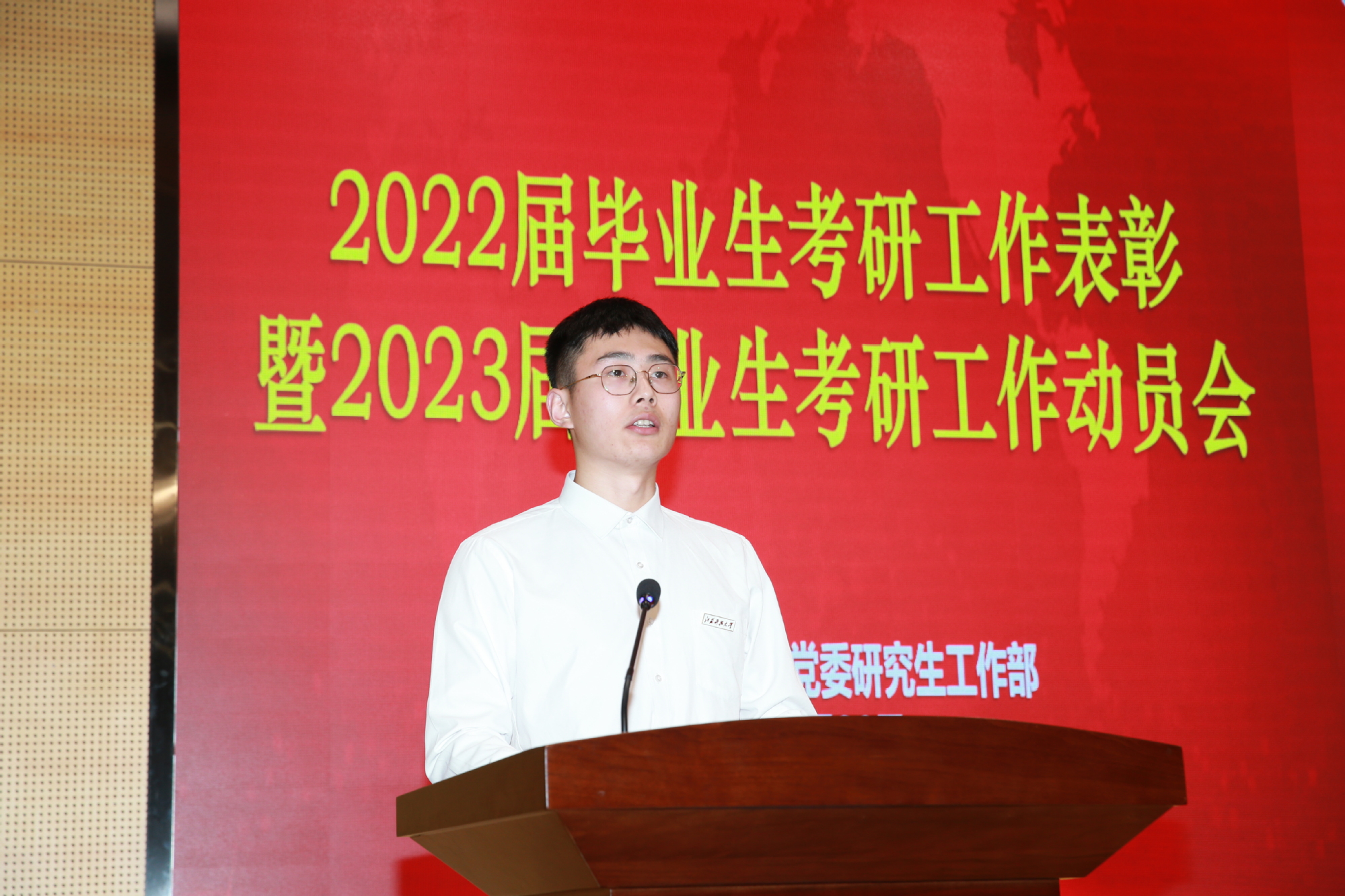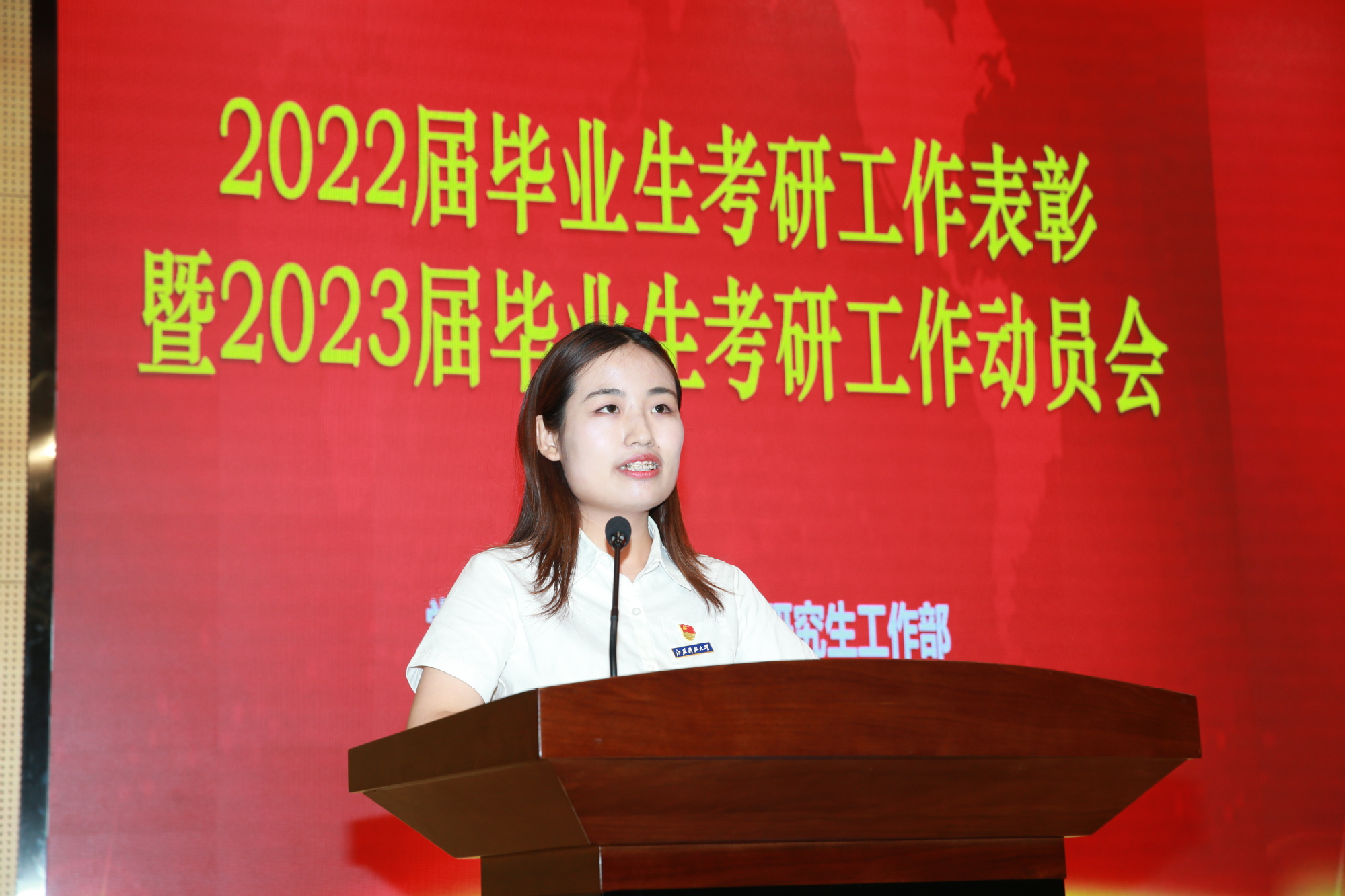 会上,学生处处长胡爱祥总结了2022届毕业生考研整体情况,部署了2023届毕业生考研指导工作。报告指出,我校2022届毕业生考研指导工作取得喜人成绩,考研报考率、初试达线率、最终录取率均稳步提升。截至5月30日,考研录取人数为1179人,录取率为28.78%,其中境外高校留学人数62人、“双一流”高校录取人数611人;深蓝学院深蓝班、粮食学院、材料学院等8个学院考研录取率超过29%;能动学院、船海学院、电信学院等10个学院的考研录取率较2021届有所增加,其中能动学院增幅最大,录取率比2021届增长14.44个百分点;10个班级的考研录取率超过50%,其中材料学院金属材料(腐蚀与防护方向)录取率达到65%;20个宿舍实现全员录取。报告指出,分析工作,总结经验,我校当前的考研指导工作仍存在三个方面的不足,具体体现在:人才培养与考研指导融合度需要进一步加强,考研指导实效性有待提升;学生学业基础与目标定位匹配度需要进一步提高,院校选择精准性有待提高;学校高质量发展对出国留学带动不够,学生培养国际化有待进一步加强。在对未来的工作规划中,报告提出,未来将强化培养学生的科研创新能力,不断提升学生考研竞争力;不断增强工作方法创新性,提升指导工作针对性;加大考研服务支持度,提升指导工作满意度。