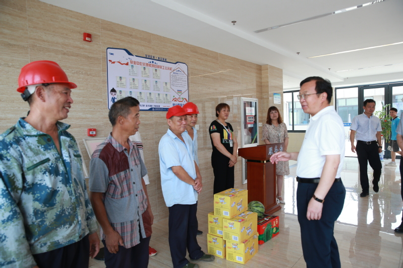 在文理大楼物业中心,周南平校长与物业管理人员一一握手表示感谢,他说,大家为美化校园出力流汗,让校园美了,师生心情舒畅了,江科大的美丽校园有大家辛勤的汗水,酷暑之中,大家也要做好自我防护,根据天气情况调整作息时间。