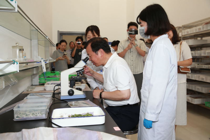 在生物技术学院,备战今年“挑战杯”中国大学生创业计划竞赛和2023年“挑战杯”全国大学生课外学术科技作品竞赛的师生团队正在打磨作品,校长周南平走到实验室、工作室,边了解备赛情况,边询问生活情况,鼓励师生继续努力。他表示,生物技术学院的科技创新很接地气,实用价值高,一定要坚持,要与蚕业研究所的国家队地位相匹配,同时,校团委要做好赛事的研究。生物技术学院特种经济动物饲养专业2020级硕士研究生白致远是备战创业计划竞赛的成员,他表示,这么热的天,校长来给我们加油,我们很受感动,一定会加倍努力,争取取得更好的成绩。