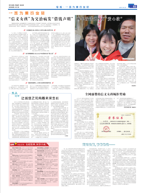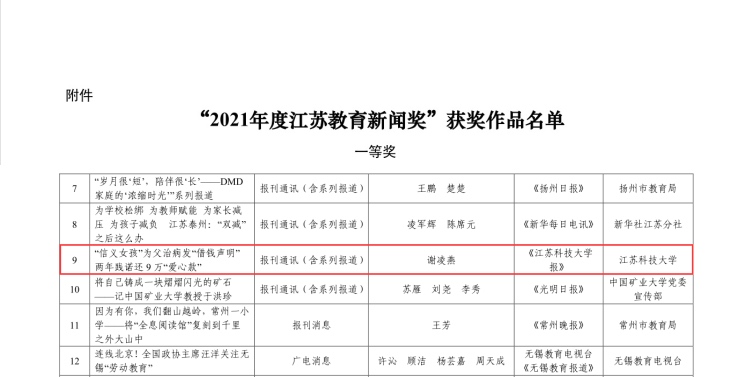 “2021年度江苏教育新闻奖”评选日前揭晓,由《江苏科技大学报》原文刊登并推荐报送的作品《“信义女孩”为父治病发“借钱声明”两年践诺还9万“爱心款”》(作者:谢凌燕,原载于2021年4月25日《江苏科技大学报》第802期)获得一等奖,这是学校校报作品首次获得“江苏教育新闻奖”一等奖,也是全省高校校报唯一的一件一等奖作品。