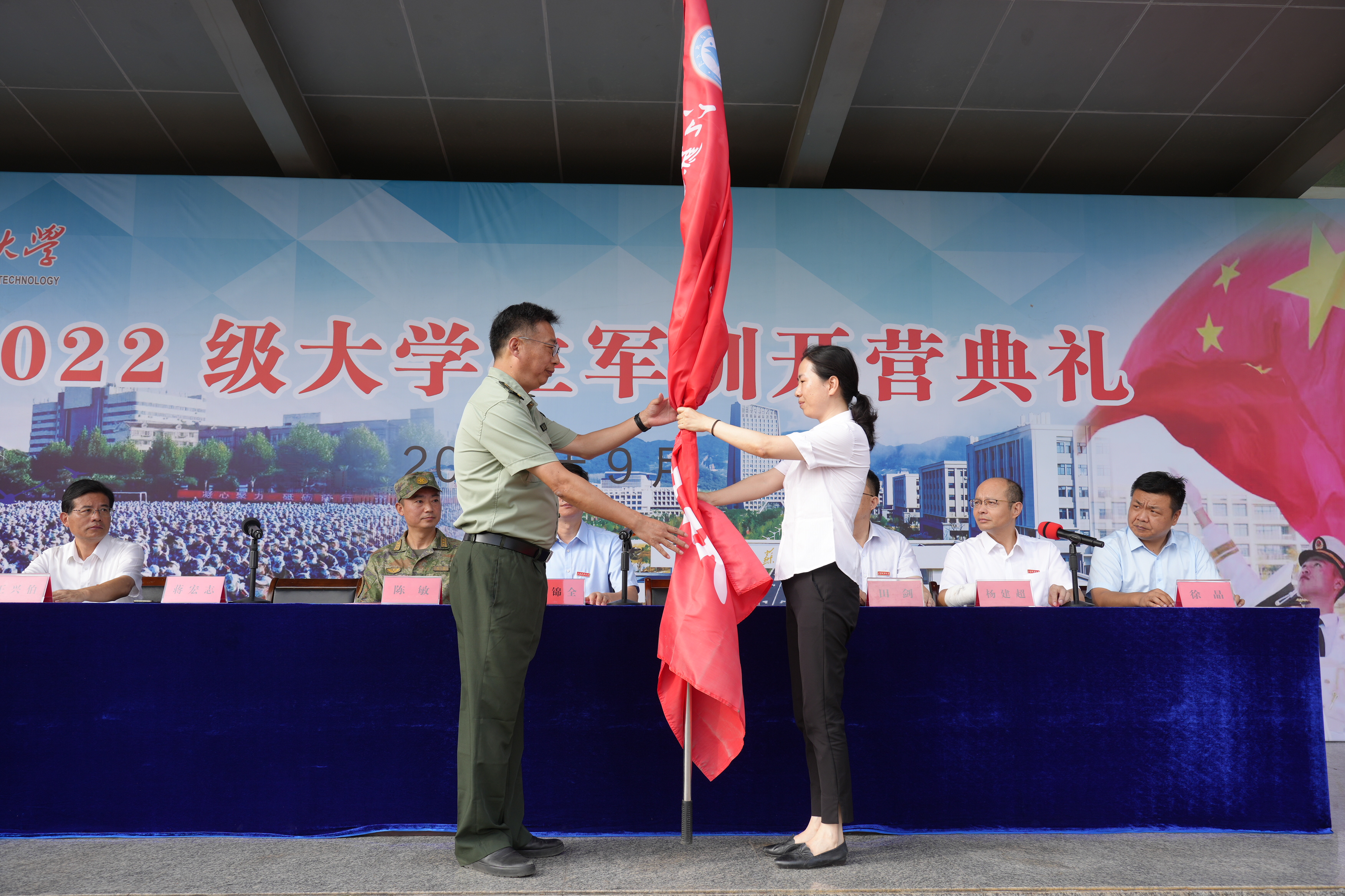 开营仪式上,部队教官们首先给同学们展示了队列基础动作和军体拳,赢得了同学们的热烈掌声。在雄壮的国歌声中开营仪式正式拉开帷幕。人民武装部部长蒋宏志宣布江苏科技大学2022级大学生军训旅编成命令,军训旅下设16营,27个连,蒋宏志任旅长,杨建超任政委。副校长任南授军训旅旗,蒋宏志接旗并为各营授营旗。