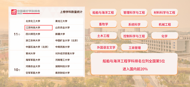 学校第五轮学科评估各学科全面进步,3个学科全部通过省优势学科三期建设项目验收,其中船舶与海洋工程获评“优秀”等级,9个学科获批“十四五”重点学科。11个学科上榜“2022软科中国最好学科排名”,其中船舶与海洋工程学科排名位列全国第5位,进入国内前20%。学科交叉融合不断强化,获批自主设置海洋技术与工程博士学位授权点交叉学科和人工智能硕士学位授权点交叉学科,获批省研究生工作站9家。学校位列USNews2023世界大学排行榜中国内地高校第130位;“2022软科中国大学排名”中国高校第147位,江苏高校第18位;ESI中国内地高校排名第159位;自然指数中国内地高校第153位。
