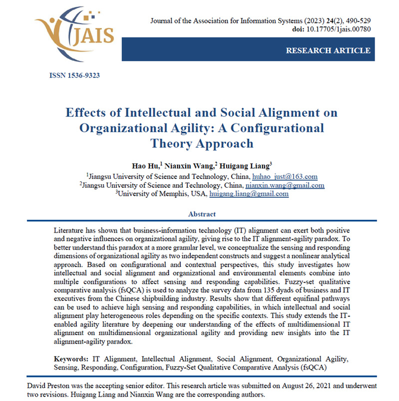 近日,学校经济管理学院管理科学与工程专业博士研究生胡皓为第一作者、导师王念新教授为第二作者,美国孟菲斯大学Huigang Liang教授为共同通讯作者的研究成果“Effects of Intellectual and Social Alignments on Organizational Agility: A Configurational Theory Approach”,发表在信息系统学科顶级期刊Journal of the Association for Information Systems,江苏科技大学为论文的第一作者单位。