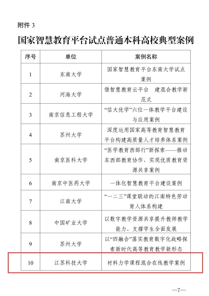 近日,江苏省教育厅公布了《省教育厅办公室关于推广国家智慧教育平台试点工作典型案例的通知》(苏教办信函〔2023〕6 号),遴选了体现江苏特色、有创新、可复制的43个典型案例,其中,试点普通高校典型案例10个。我校组织申报的《材料力学课程混合在线教学案例》成功入选试点普通高校典型案例。