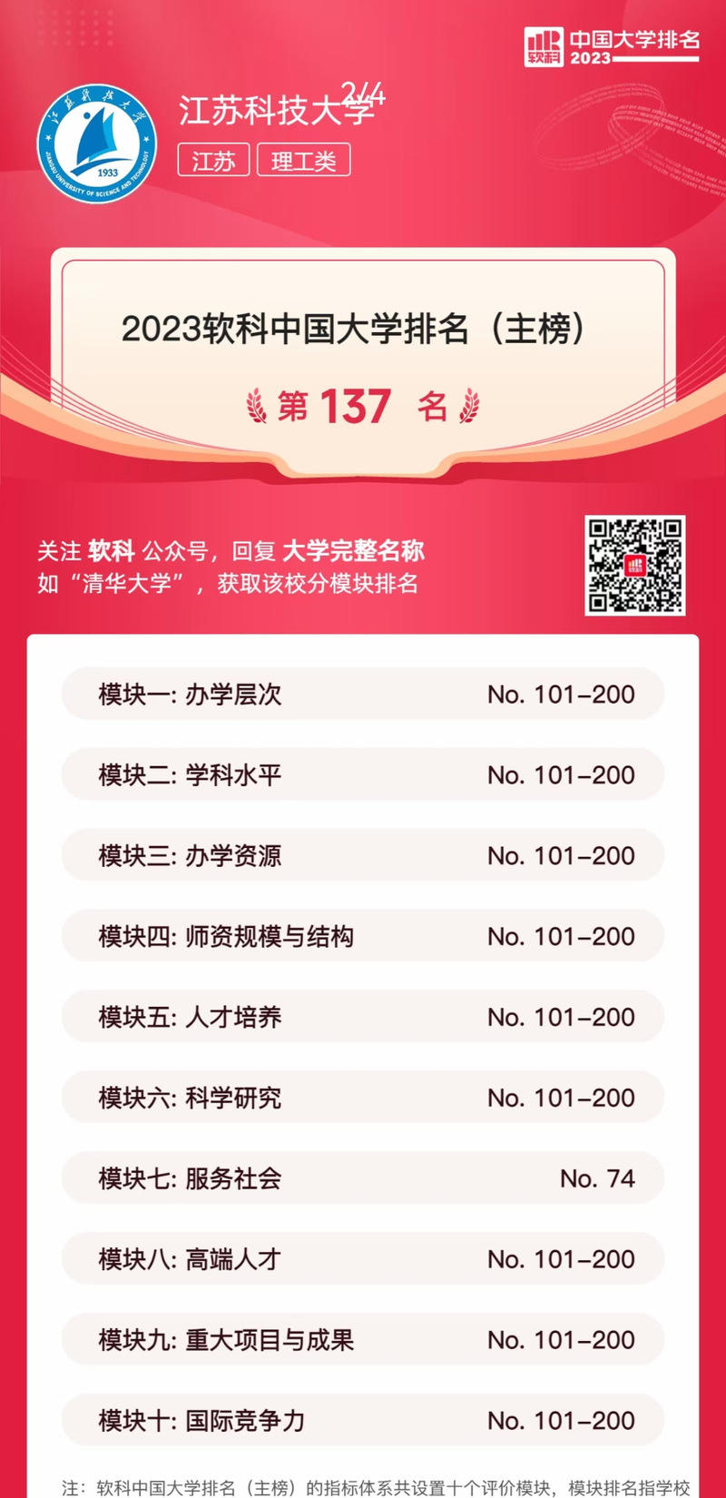 3月30日,高等教育专业评价机构软科正式发布“2023软科中国大学排名”。江苏科技大学位列中国高校第137位,较2022年提升10位,在江苏高校中排名第18位。