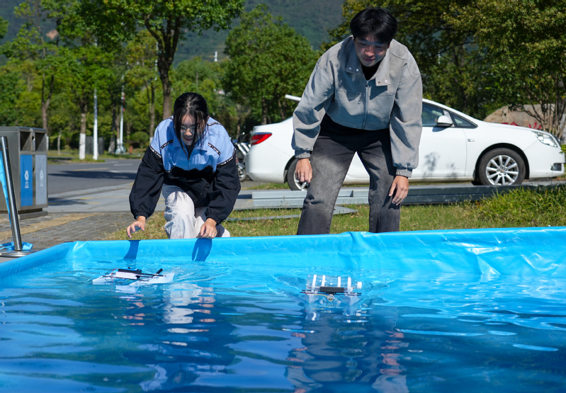 本次活动恰逢临近学校校庆,青年大学生们在自制的船模空白处写下一句句对学校的真挚祝愿。座谈结束后,还举行了思政领航馆首场大学生科创活动——帆船竞速比赛,现场氛围热烈。