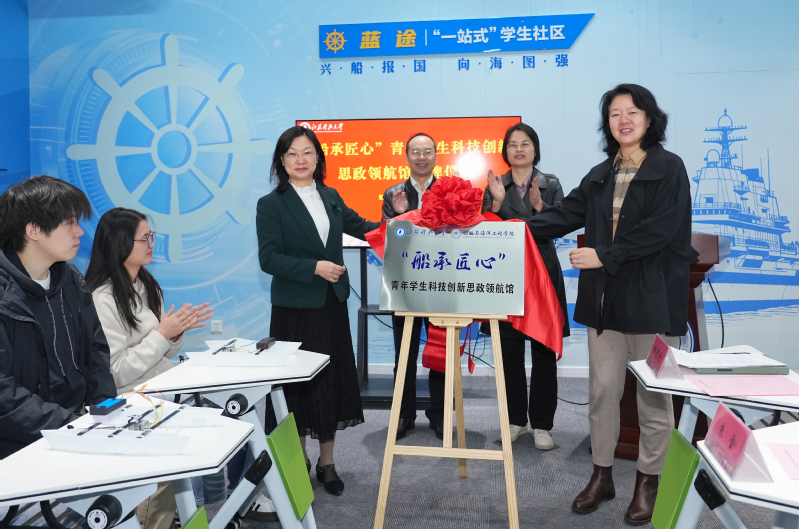 嵇春艳等领导共同为“‘船’承匠心”青年学生科技创新思政领航馆揭牌,标志着学校这一融合思政教育与科创实践的崭新育人阵地的正式启用。“‘船’承匠心”青年学生科技创新思政领航馆由“深蓝之光”船舶科技作品舫、“云帆智航”船舶科技创新工作舫、“蓝途”一站式学生社区、“‘船’承领航”辅导员工作室四大板块组成,集中展示了国家海洋强国重要战略、江科大校友“以青春铸船魂”的系列奋斗故事以及优秀学子科技创新作品;同时,思政馆的建成,也是学校“一站式”学生社区建设的重要延伸,使得思政教育、学业指导、科创支持“融入日常、浸润成长”,社区育人功能“精准落地”。