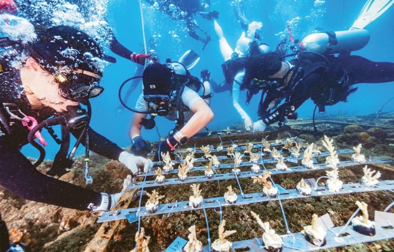 近年来,海南持续开展珊瑚礁生态系统的保护和修复,创造了单体修复面积最大、累计种植数量最多等多项全国纪录。截至2025年底,海南通过系统性工程累计新增珊瑚礁修复面积27.8公顷。图为2025年6月8日,2025年世界海洋日主题宣传活动在三亚大东海举行,50名专业持证潜水员潜入大东海海域开展珊瑚移植公益行动。海南日报全媒体记者 王程龙/摄